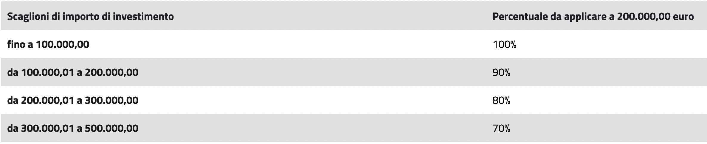 Per le PMI agricole che investono in attività ricadenti negli altri settori o per le PMI agromeccaniche, il contributo a fondo perduto, nell’ambito del de minimis, è quantificato applicando a 200.000 euro una percentuale individuata sulla base dell’importo totale dei costi ammissibili.